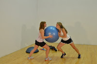 Ball Pushers: One partner stands with a large ball ready to push back the partner coming at them. Push back each other using shoulders - this is a super fun one with cardio benefits too! Try to push your partner back a few feet before switching turns.